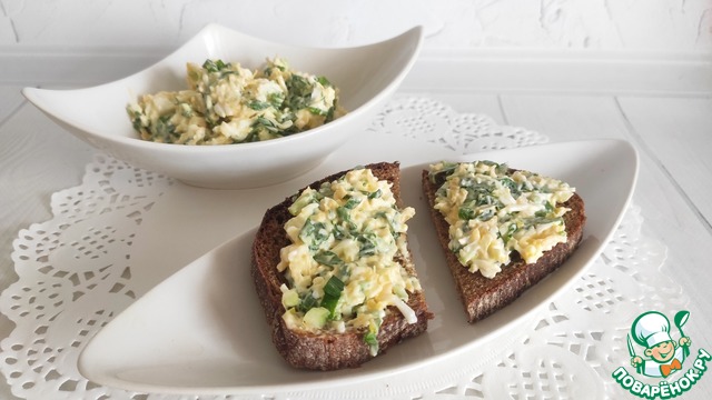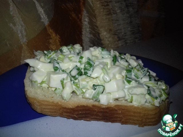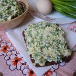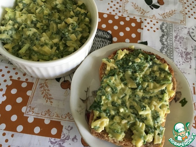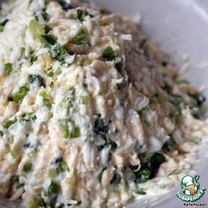 Перемешиваем мятую черемшу, сыр, яйца, сдабриваем все майонезом. Я еще немного сметаны добавила - нравится мне заправка сметана + майонез!