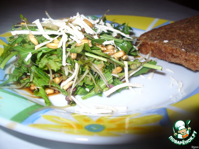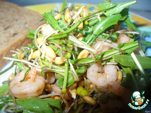 Хотя за окном еще откровенная зима, очень хочется чего-нибудь весеннего, свежего, зеленого... Вот, хотя бы такой салатик... Почему-то хочется назвать его весенним... На самом деле, один из моих самых любимых салатов в последнее время. Острые проростки горчицы отлично дополняют пресные проростки пшеницы, пряная рукола оттеняет свежесть креветок, в общем, легкая, свежая и вкусная закуска! Подходит для поста.