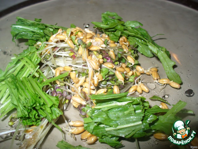 • У проростков горчицы отрезать корешки. Хорошо промыть. Выложить в салатник.