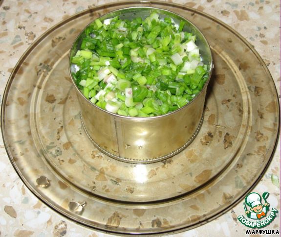 Уплотняем компоненты (иначе салат распадется при убирании формы) и посыпаем зеленым луком.