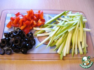 Цуккини нарезать тонкой длинной соломкой, маслины – кружочками, перец – кубиками.
