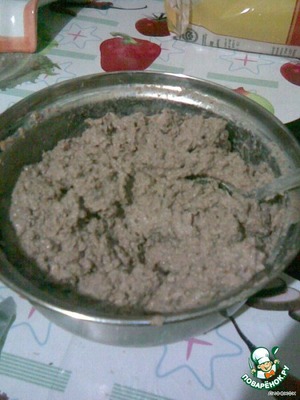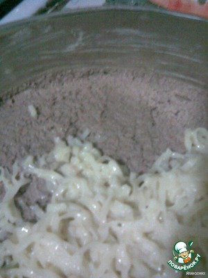 Печень и морковку, сырой лук, обжаренный лук перемешать, если надо - добавить еще специи и подлить бульон, оставшийся после варки печени.