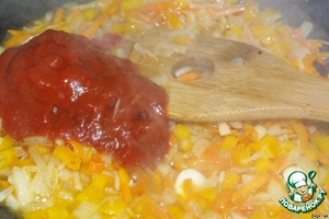 Добавляем томатную пасту (летом только помидоры, сейчас это бесполезно, так как они безвкусные. Но можно использовать томаты в собственном соку, у меня их в этот момент просто не было), немного обжариваем её и потом добавляем немного бульона (из кастрюли, в которой варятся свекла и грибы), тушим минутки 3-4.