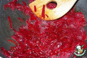 Воду, в количестве 2 литров, ставим на огонь. Тем временем очищаем и нарезаем соломкой свеклу (сырую). Сбрызгиваем половиной нормы уксуса, и обжариваем на растительном масле.