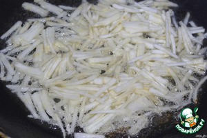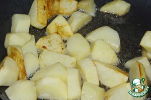 Очищаем картофель, нарезаем (я в борще люблю довольно крупно). Обжариваем картофель на растительном масле. Необязательно доводить его до готовности, важно, чтобы образовалась корочка. Это нужно для того, чтобы картофель в борще оставался целым, хотя многие меня и не поймут (те, кто любят даже специально помять картофель для борща), но я, сколько себя помню, ещё бабушка так делала.. И не представляю по другому.