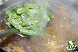 И через 5 минут - фасоль. Почему стручковая? Изначально этот борщ варился с обычной, но использовать консервированную не очень хочется, а варить сырую долго. Вот и появился как-то этот вариант у меня. И прижился, так как вкус совсем другой получается.