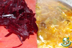 Теперь нарезаем отварную свеклу соломкой, сбрызгиваем оставшимся уксусом, добавляем в борщ. Этот момент нужен для того, чтобы у борща появился насыщенный свекольный цвет. Потому что сырую свеклу, хотя и обжариваем с уксусом, но она при варке, всё равно цвет теряет. Можно добавлять только отварную свеклу, в конце, но тогда вкус всё-таки не тот будет.