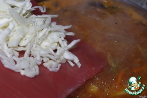 Добавляем капусту, нарезанную соломкой (короткой или длинной - тут уж, как Вы любите. У меня и такая и такая).