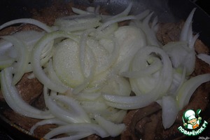 Добавляем нарезанный кольцами лук. Я нарезала не поперёк, как обычно, а вдоль. Посыпаем его немного сахаром - по вкусу. Обжариваем вместе с печенью, 5 минут.