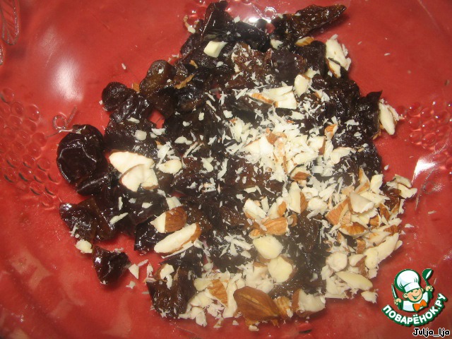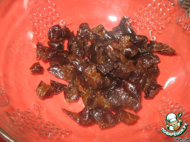 Нарезаем чернослив. Если он мягкий, то его не нужно распаривать, если не очень, то лучше залить минут на 5 кипятком.