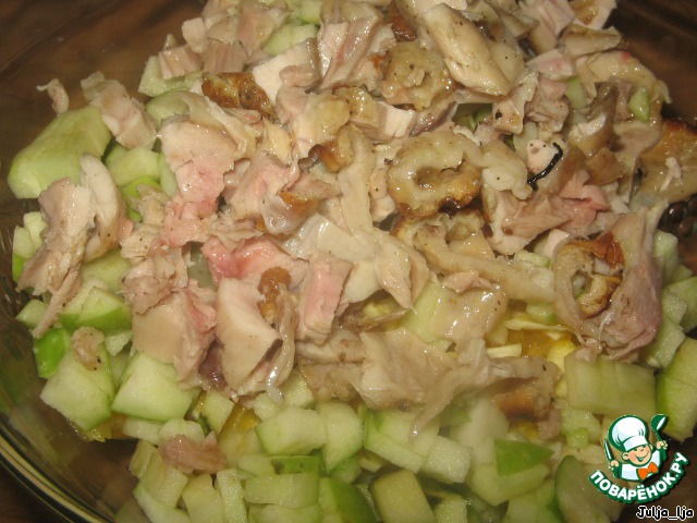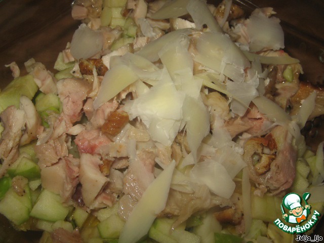 Исключительно женский салатик.. Для любителей сочетания мяса и фруктов.. фруктов и сыра.. сыра и орехов.. Мне очень понравилось, а готовилось, как и в большинстве случаев, экспромтом.
