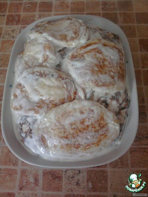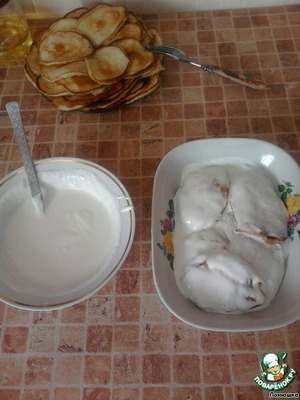 А дальше еще проще: смешиваем сметану и оставшийся сахар. Макаем туда оладьи и аккуратно складываем в глубокую тарелку.