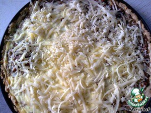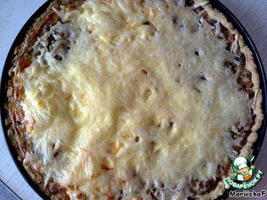 Выпекайте 40-50 минут при температуре 160-180 град. Когда пирог будет почти готов, посыпьте его сыром (сыр натереть на крупной терке) и поставьте опять в духовку до расплавления сыра.