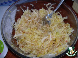 А в это время (чтоб не простаивать без дела), натрём на крупной тёрке яблоки, лимон (косточки по мере попадания убираем), добавим сахар, всё перемешаем... отставим в сторонку и займёмся творогом.