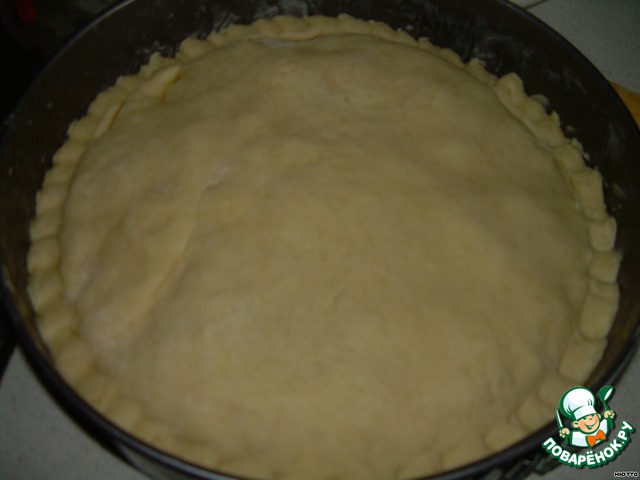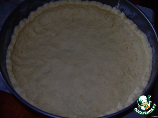 Достаём из холодильника наше тесто, отщипнём 2/3, остальное уберём опять в холодильник (но лучше в морозильник), форму диаметром 26 см выложить бумагой для выпечки, всё тщательно смазать сливочным маслом и пальчиками разравнять тесто по дну и бортикам формы... Стараться, чтоб не было дырочек...