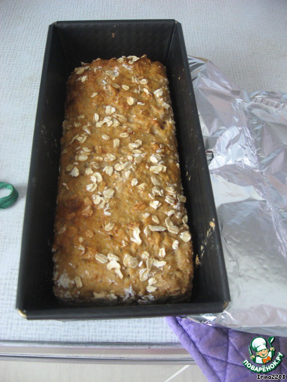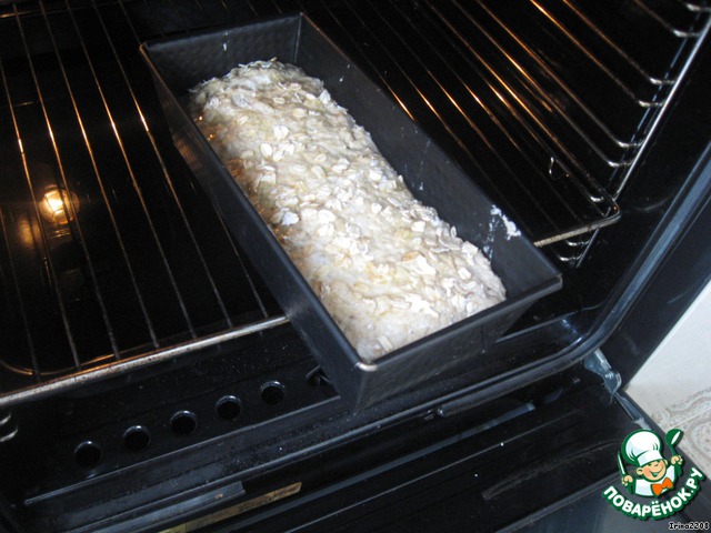 Выложить тесто в форму (смазанную растительным маслом), оставить минут на 20 подходить, смазать яйцом, посыпать овсянкой и выпекать при 220 град 20 минут (вниз духовки поставить емкость с водой) и потом ещё при 200 град. 40 минут (форму накрыть фольгой, емкость с водой убрать).