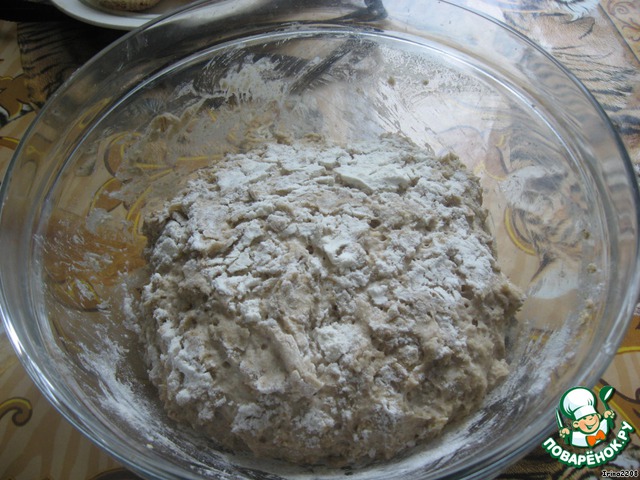 Воду вливать, пока тесто не станет густым, чуть липким (примерно стакан жидкости уходит). Скатать тесто в шар, припылить мукой и оставить до увеличения в 2 раза.