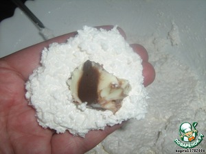 Затем слегка расплющиваем ее и в серединку кладем немного "Нутеллы" (ее у меня тоже не оказалось, поэтому я использовала обычную шоколадную пасту) и формируем шарик, чтобы начинка осталась в середине.