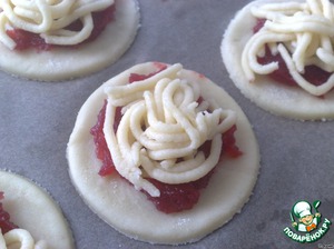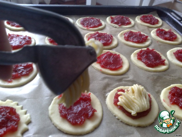 Выдавливаем из неё "вермишелины" на наши печеньки. Когда выдавится достаточно, подрезаем "вермишельки ножом. -