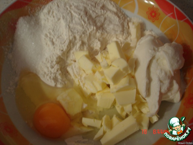 • Смешать масло, муку, яйцо, соль, сахар, сметану.