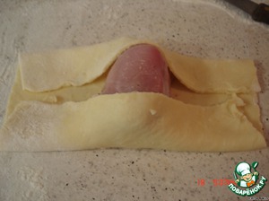 • Раскатать прямоугольник, положить мясо, на него кусочек сыра.