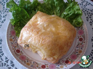 • Укладываем на противень, смазанный маслом. Сделаем маленькие дырочки, чтобы воздух выходил, ставим запекать при 200 гр. 30 мин.