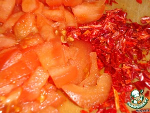 Добавляем помидоры, перец чили и томатную пасту. Тушим 7-8 минут.