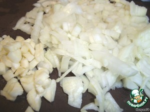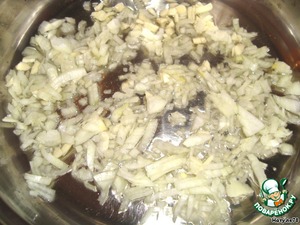 Наливаем в сковороду растительное масло, выкладываем лук и чеснок. Обжариваем до золотистого цвета.
