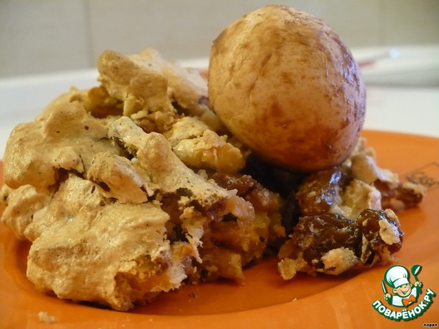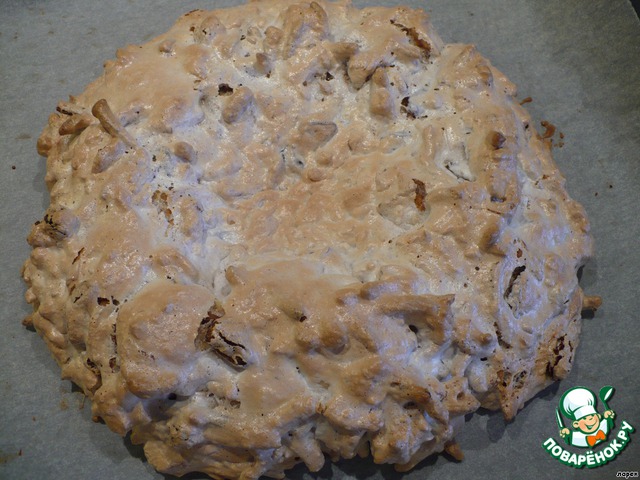 Пока наша основа для гнезда остывает, готовим крем. Взбиваем белки, сахар. Когда белки достаточно загустели, добавляем рубленные орехи и изюм. Перемешиваем ЛОЖКОЙ.