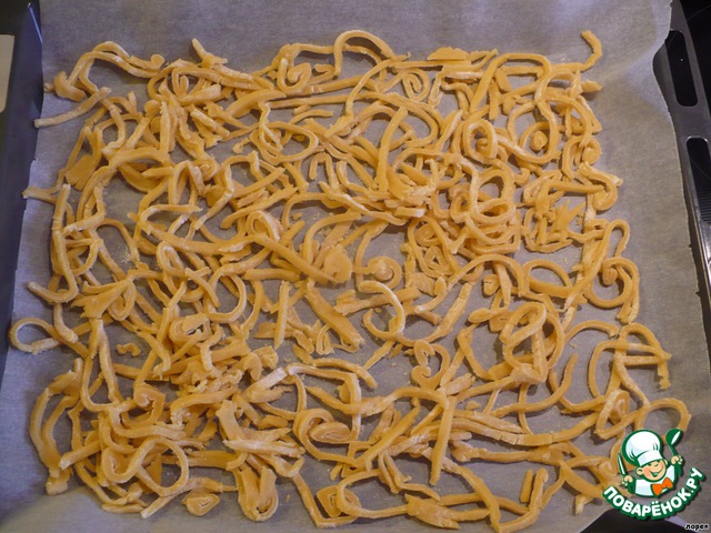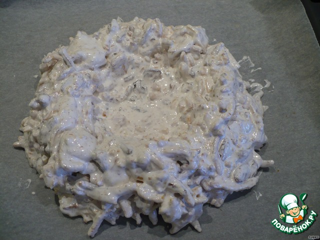 Теперь добавляем в массу остывшую лапшу, перемешивам и выкладываем на противень в форме гнезда. Bыпекать (скорее подсушивать) при температуре 150-170 градусов.