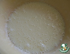 Тем временем сделаем заливку. Взбиваем стакан сметаны, яйцо и 0,75 стакана сахара, добавляем 2 ст. л. муки.