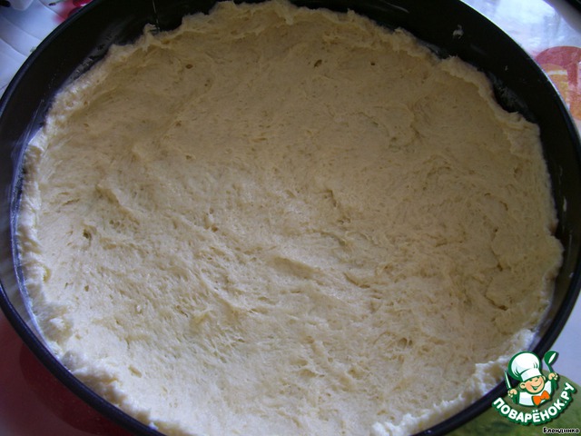 Распределяем тесто в форме, формируя бортики и отправляем в разогретую (до 180 градусов ) духовку на 10 минут, чтобы основа пирога «схватилась». По прошествии 10 минут вынимаем и отставляем в сторонку - немного остыть (духовку не выключаем!)