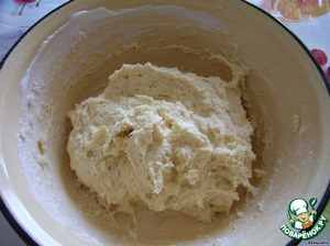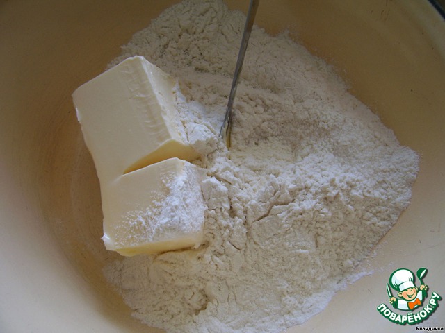 Для теста смешиваем размягченный маргарин, муку (стакан с горкой), сахар (1/2 стакана), разрыхлитель для теста, и 2 столовых ложки без верха сметаны (честно говоря, на свою форму я размахнулась, на мой вкус теста можно и поменьше, но это кто как любит конечно)