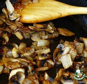 Добавить к луку грибы, нарезанные пластинками и жарить до готовности. Остудить.