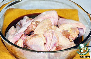 Куриные крылья подготовить для использования. Сделать на крыльях проколы иголкой или небольшие надрезы ножом. Залить маринадом и оставить не менее чем на час, лучше на два-три или на ночь.
