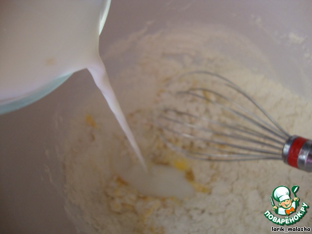 Я чуть схитрила: яйца были крупными - 2/3 яйца добавила в тесто и 1/3 оставила на заливку. Молока в заливку добавила 70мл. Оказалось вполне достаточно.