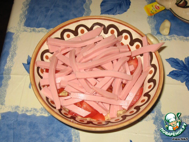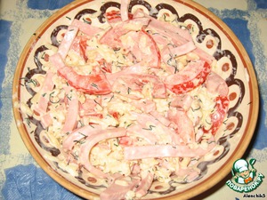 Добавляем нарезанную соломкой ветчину (у меня ветчины не оказалось, взяла вареную колбасу, вкус не портит)