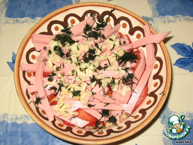 Добавляем пропущенный через чесночницу чеснок и мелко нарезанный укроп.