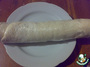 Если тесто готовим впрок на будущее, то раскатываем тесто в пласт, покрываем его пищевой пленкой, сворачиваем в рулет и в морозилку