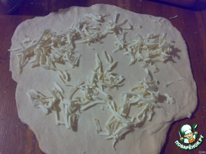 На рабочую поверхность выкладываем тесто и раскатываем в пласт толщиной 0,5-1 см, на него, на крупной тёрке, трём масло или маргарин.