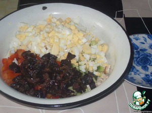 Чернослив, если требуется, залить кипятком, чтобы разбух. Воду слить, чернослив мелко нарезать и добавить к салату.