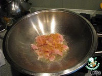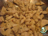 В хорошо разогретый вок наливаем масло, прогреваем и выкладываем курицу, посолив, поперчив и добавив специй.