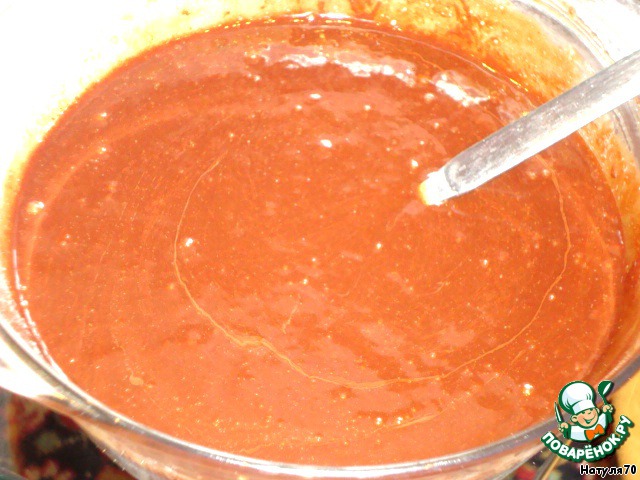 Ввести муку в шоколадную массу в три приема, каждый раз тщательно перемешивая. Готовое тесто накройте пищевой пленкой и оставьте на один час. Тесто станет воздушным и пористым. Когда будете перекладывать тесто на противень, сразу поймете, какое у вас прекрасное тесто :-) !