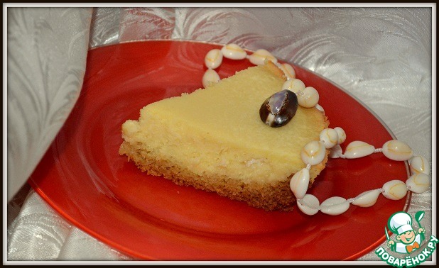 3. За это время сделаем творожно-кокосовую массу. Кокосовое молоко, творог, 150 г сахара, 2 яйца и белок взбить миксером. Вылить это на немного остуженный корж и поставить в духовку на 65 минут при 160 градусов.
