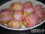 Hеочищенный картофель отварить в солёной воде, немного остудить, почистить и каждую картофелину завернуть в один или два кусочка бекона.