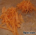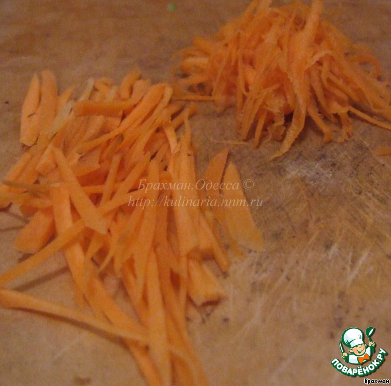 - Mорковь режем ножом ооочень тонко соломкой. На терке мне не нравится (рядом для примера натер), поэтому я режу ножом.