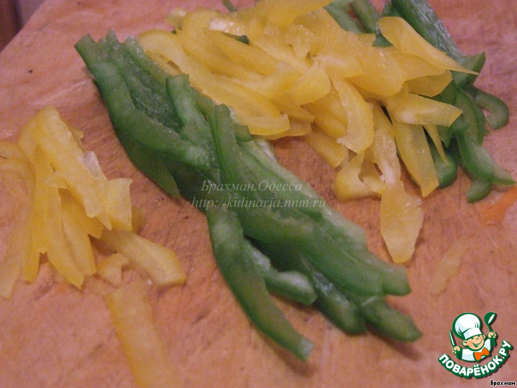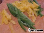 - Перец очищаем, срезаем лишнее и режем соломкой. -