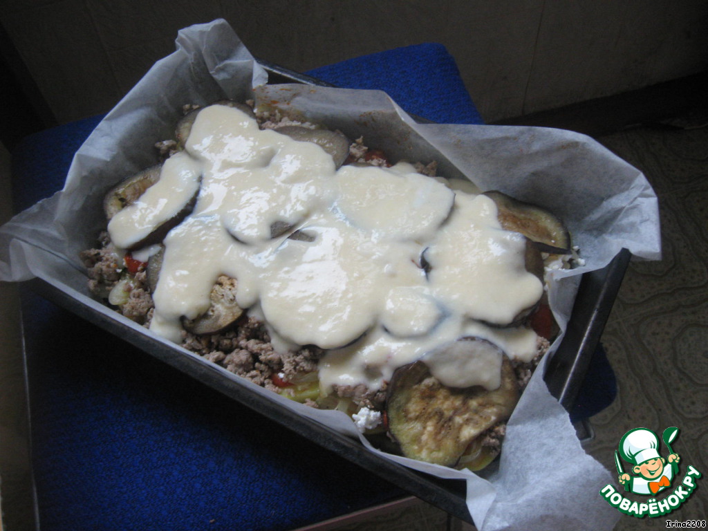 На фото подготовленные продукты. Пошагово было некогда фоткать. БАКЛАЖАНЫ: кружочками обжарить на растительном (оливковом) масле, КАРТОФЕЛЬ: отварить до полуготовности и порезать кружочками, ЛУК: полукольцами обжарить и добавить тертый ЧЕСНОК, ФАРШ: обжарить, посолить-поперчить и добавить базилик. СОУС 1 - помидор порезать и обжарить на сковороде, добавить туда томатную пасту, разведенную водой, (чтоб был 1 стакан жидкости) и уварить до легкого загустения. СОУС 2 - муку обжарить на сливочном масле, постепенно влить молоко и довести до кипения. Если есть комочки - пропустить через сито (у меня комочки были) в конце добавить яйцо и все взбить. ВНИМАНИЕ - я солила и приправляла только фарш т.к. фета соленая, если вам масло соли можете посолить соусы.