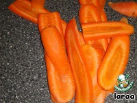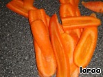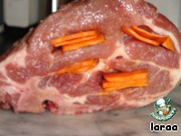 В мясе, с помощью длинного ножа, сделайте "прорези" и вставьте морковь.