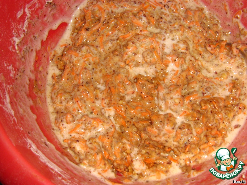 Продолжая взбивать, ввести цедру одного лимона, корицу, соль, потом тертую морковь, муку, разрыхлитель для теста и обжаренные орехи. Все перемешать. -
